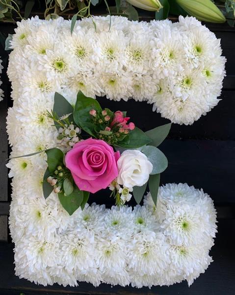 Our massed letter tributes are available with a white chrysanthemum base and sprays in a range of colours.