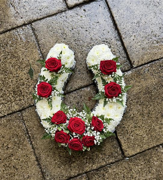 Massed horse shoe tribute with the best Dutch Naomi red roses
