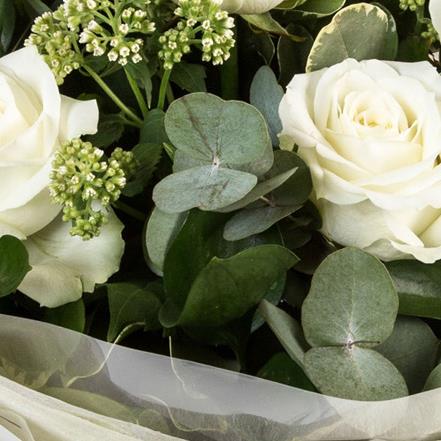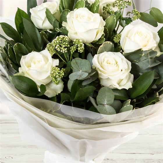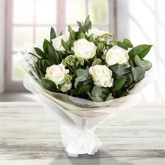 Six long stemmed top grade dutch Avalanche white roses arranged with mixed foliage presented in water.